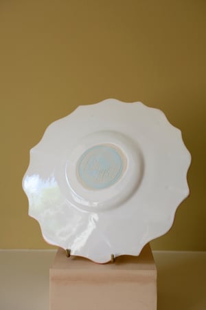 A round yellow plate with a hand cut decorative edge. The rim and inside of the plate features some slip trailed relief decoration.