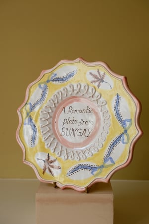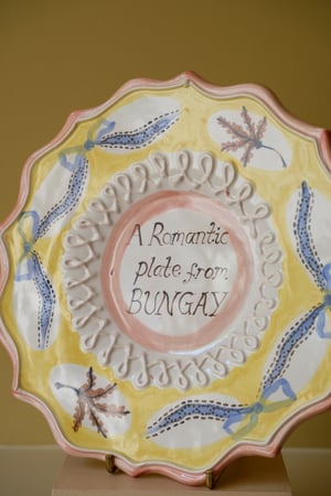 The centre of the plate is painted with 'A Romantic plate from BUNGAY'. This writing is inspired by antique Lowestoft porcelain, and an enamel box from my friends collection, featuring a similar token.