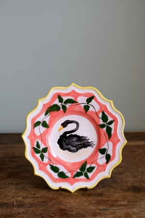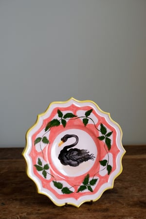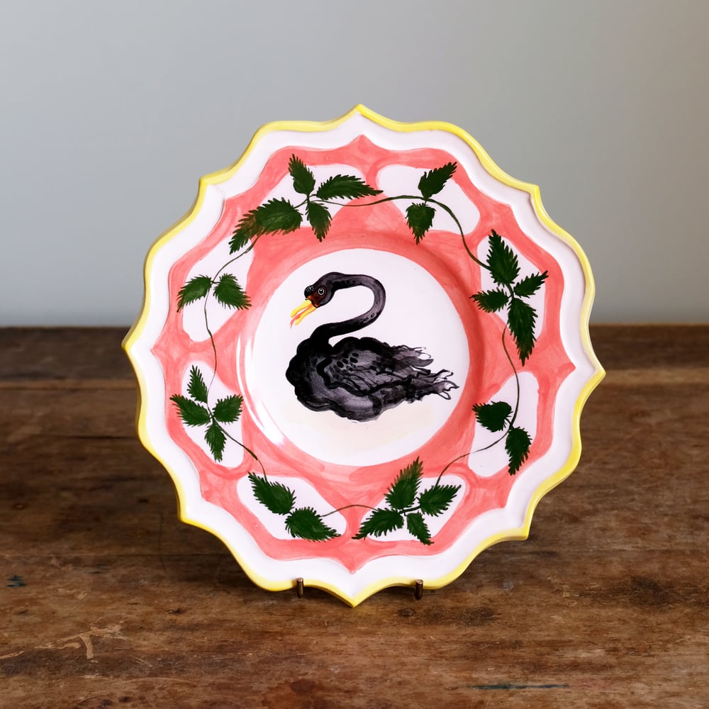 The main body of the plate is salmon pink, with a canary yellow rim.