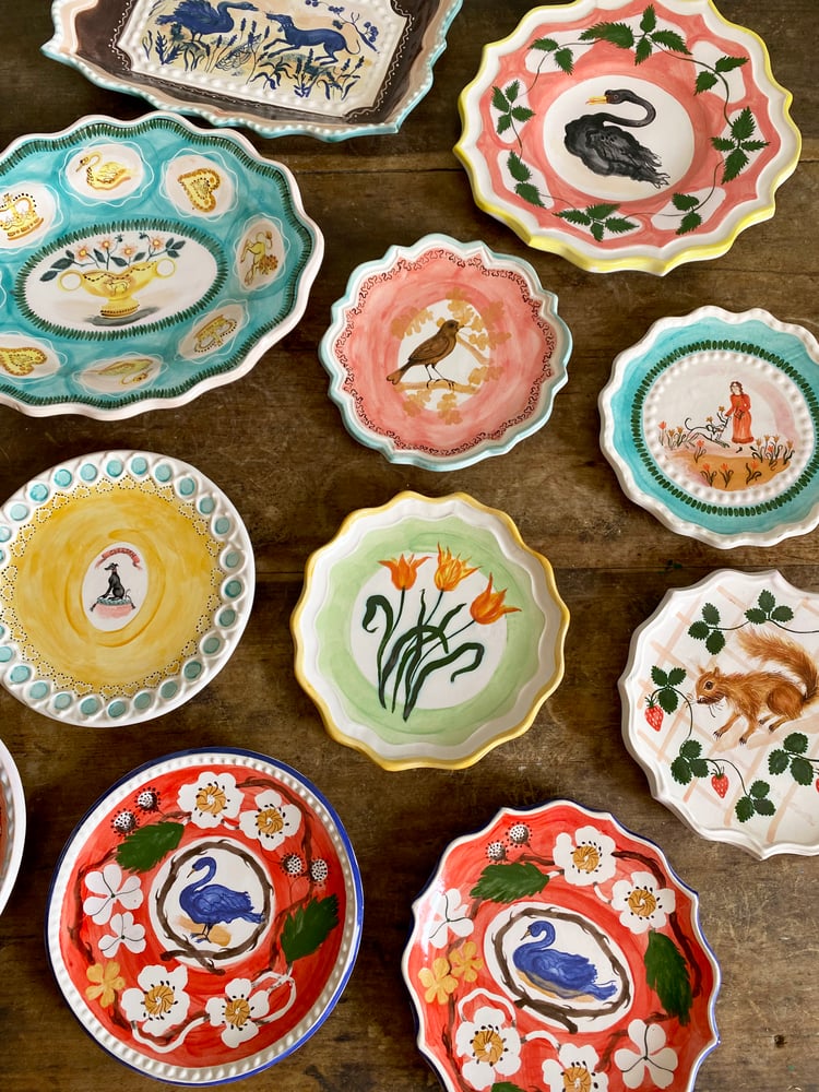 They are dipped in a tin glaze and painted using oxides and pigments.