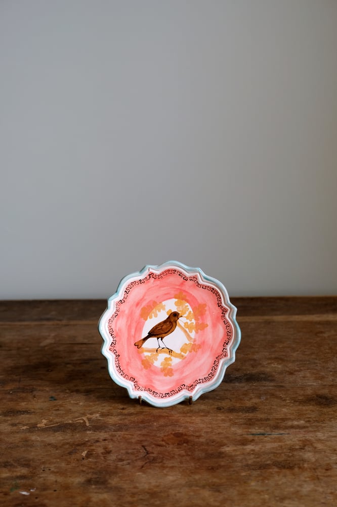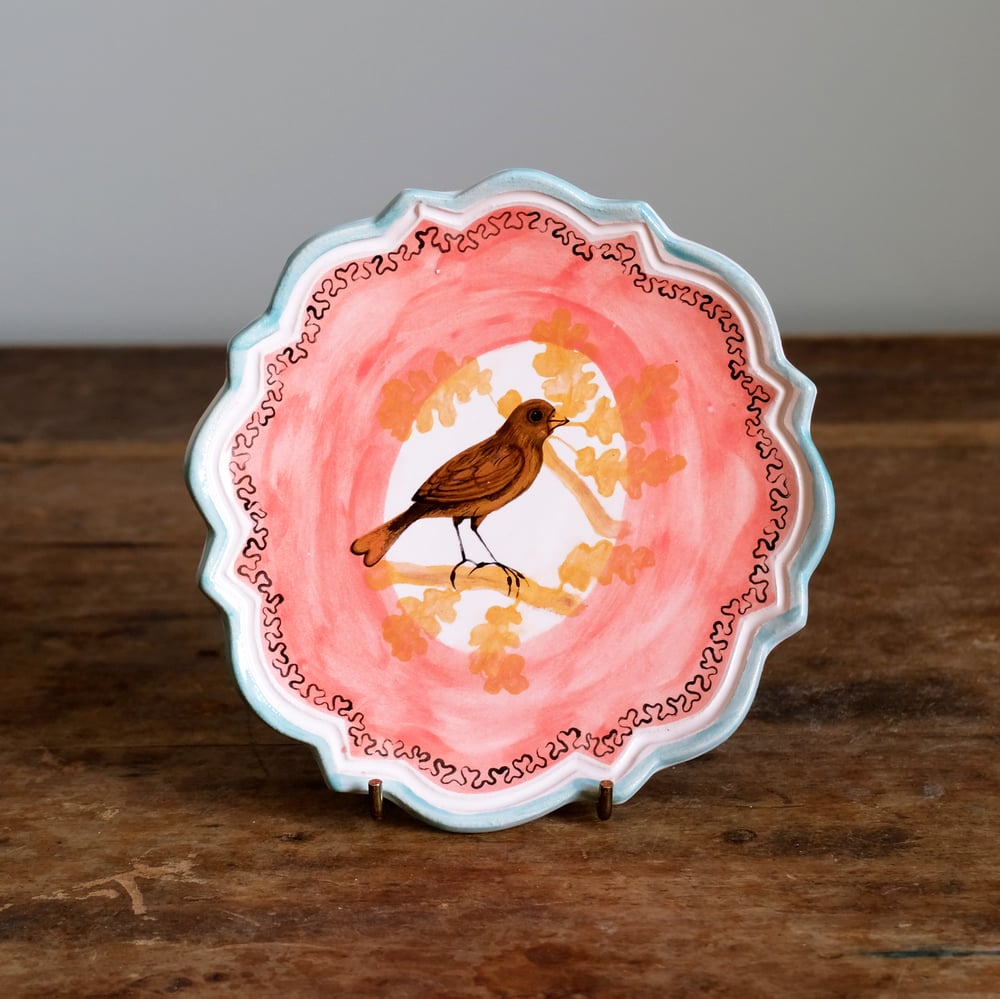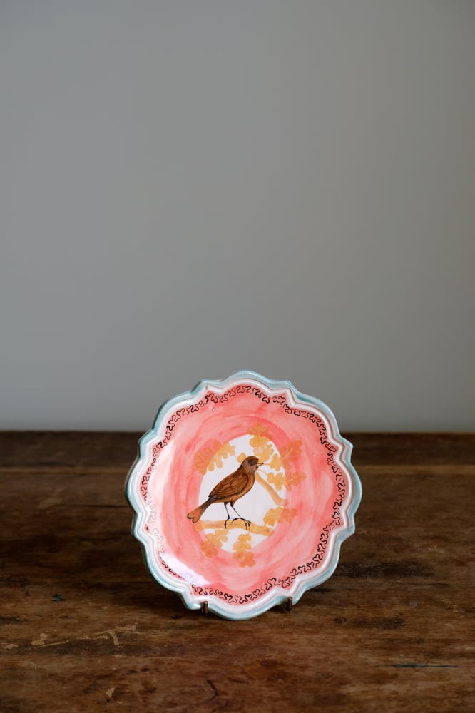 A small circular plate featuring a hand-cut edge. The rim of the plate has a slip trailed detail. The main body is painted with a Salmon pink, with the inside oval featuring a Rutile Yellow painted Canary on an Oak branch.