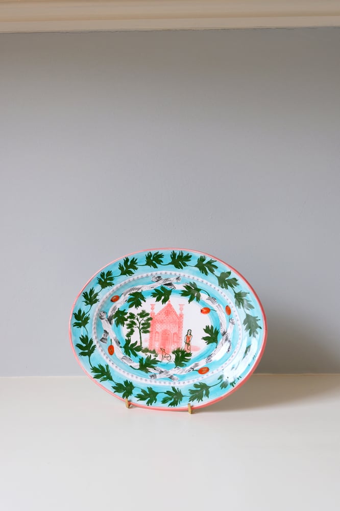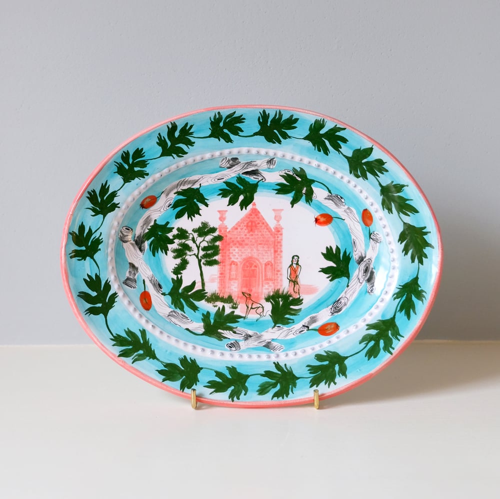 The base colour is a turquoise blue, with Chromium green Hawthorn leaves and red berries. The central illustration is a painting of a pink folly with a woman and her whippet.