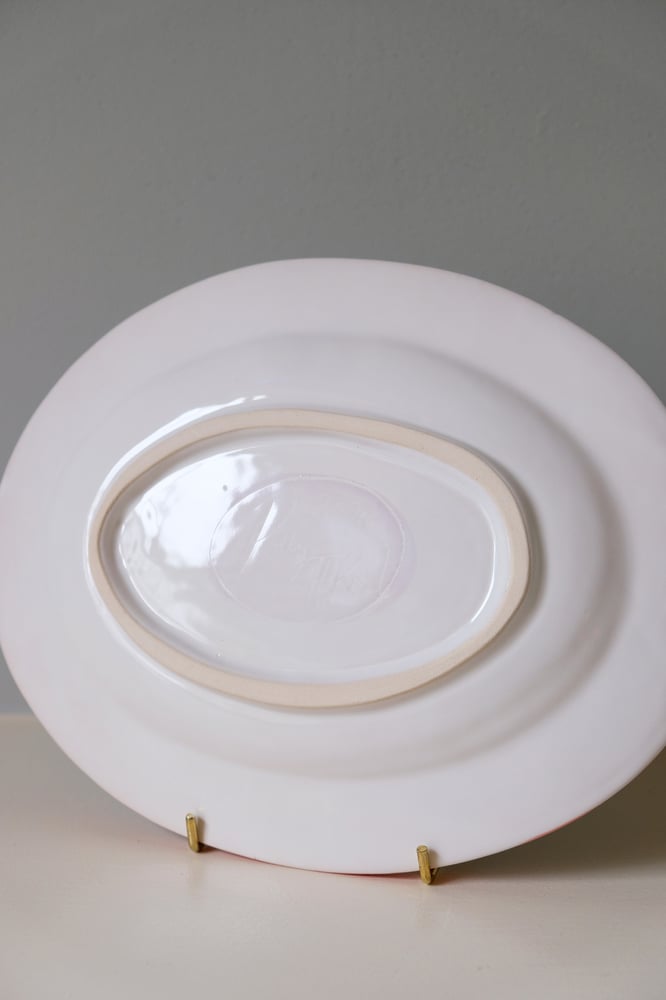 A Romantic platter with a slip-trailed decorative centre. The Hawthorn branches are decorated with a resist technique, which gives them a lovely graphic feel and contrasts with the hand-painted elements on the platter.