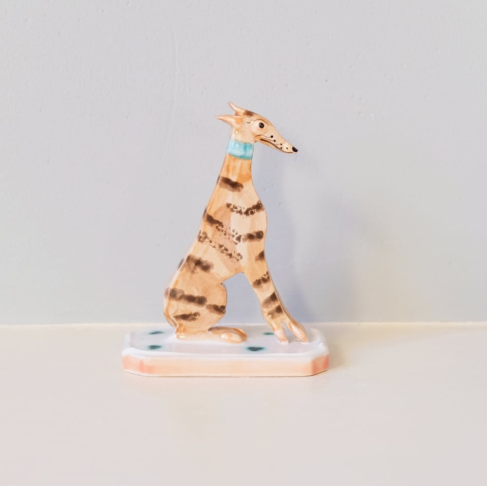 Each Whippet is cut out from a slab of clay, hand-built and hand-painted; therefore, each one has its own unique details, with some slightly bowing to add character and life to each piece. I love how my process ends up with each whippet looking like a unique character, with noses slightly longer than others, just like our beloved Whippets and Sighthounds