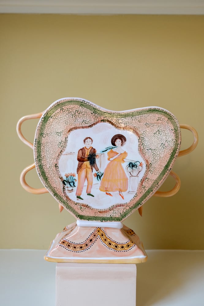The main body is painted with a peach underglaze. It has Rutile and Chromium details, and is covered in a 'vermicelli' style painted pattern, of which is inspired by Polly's collection of antique ceramics.