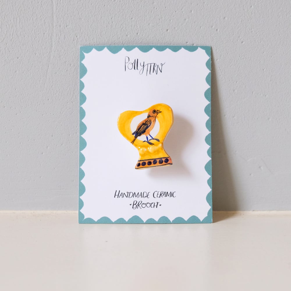 Handmade Ceramic Brooch - Romantic Vase & Canary