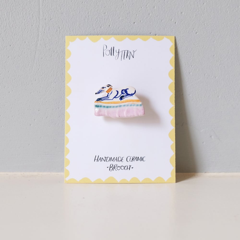 Handmade Ceramic Brooch - Whippet on cloth