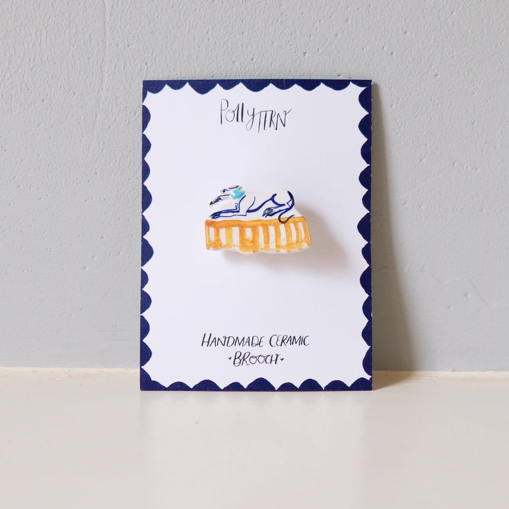 Handmade Ceramic Brooch - Whippet on Stripe cloth