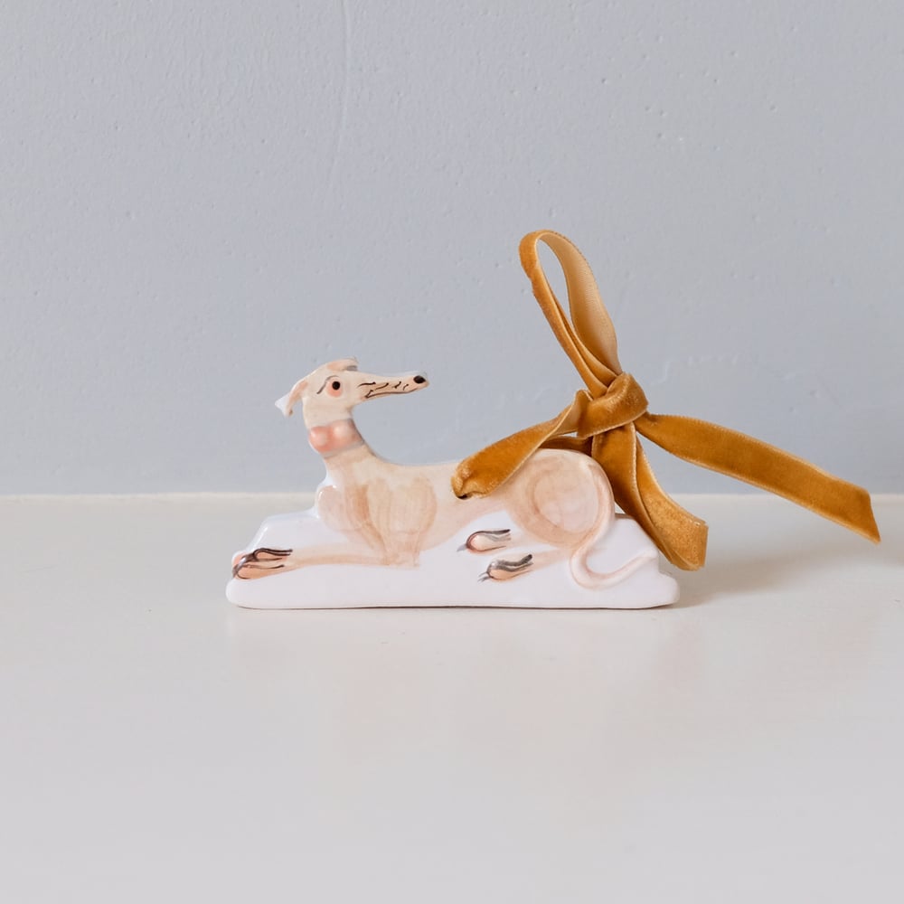 Hanging Ornament - Fawn Sighthound with yellow ribbon