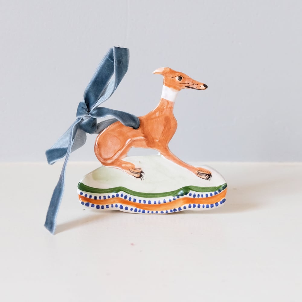 Hanging Ornament - Tan Sighthound with blue ribbon
