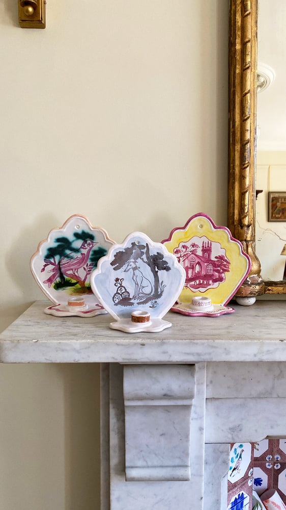 Inspired and informed by traditional ceramic shapes, but slab-built to create a modern take on a traditional vessel. Each piece is handmade and bisque-fired. They are then dipped in a Tin glaze with each one painted upon using oxides and pigments. These loose paintings upon the ceramics make each piece an original work of art. Each piece is illustrated with a drawing inspired by places, historical and childhood stories.