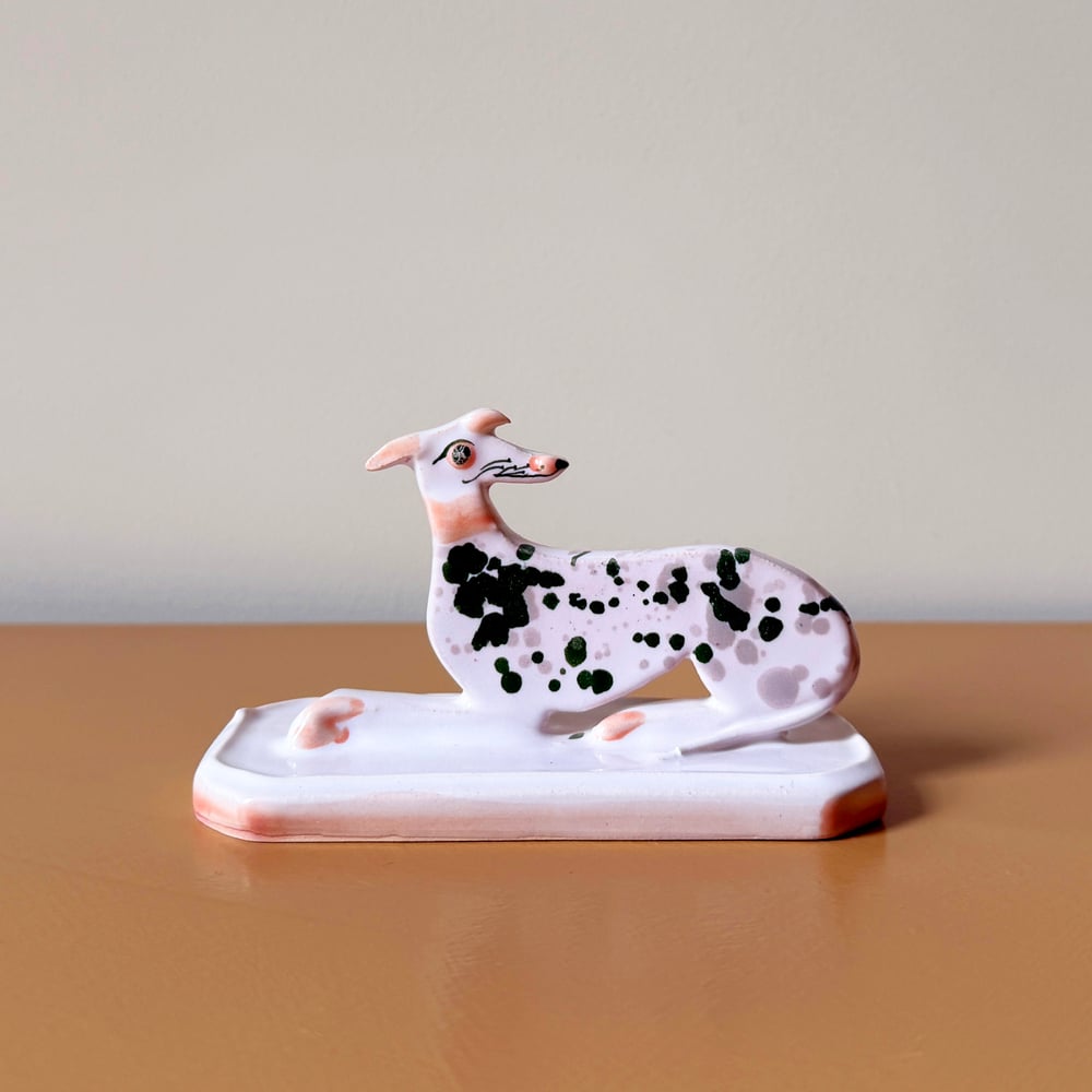 Each Whippet is cut out from a slab of clay, hand-built and hand-painted; therefore, each one has its own unique details, with some slightly bowing to add character and life to each piece. I love how my process ends up with each whippet looking like a unique character, with noses slightly longer than others, just like our beloved Whippets and Sighthounds