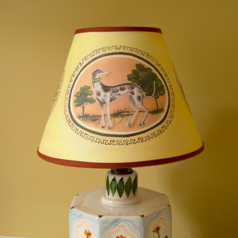 This design features three ovals running around the shade with paintings of Sighthounds, Oak leaves and a Canary