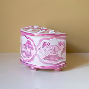 The ovals on the front feature Pink Lustre paintings of a bird, sighthound and a squirrel.