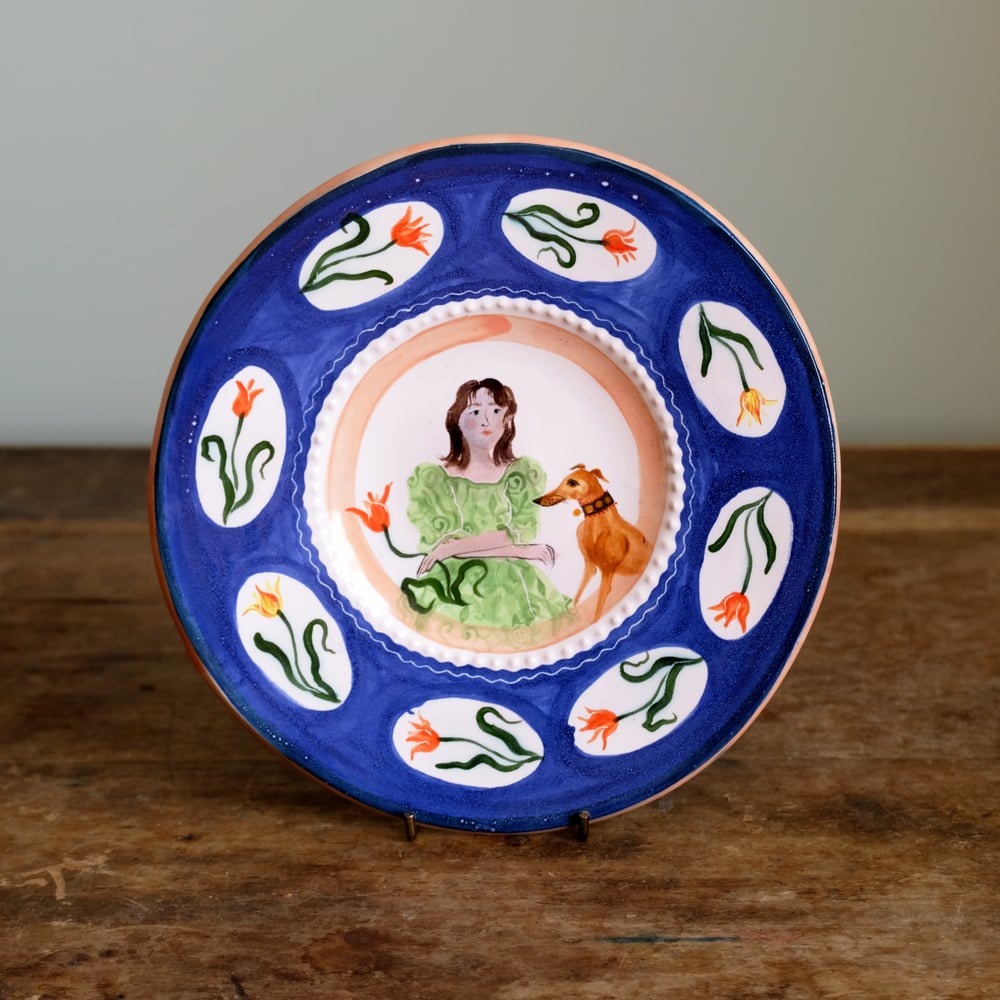 The main body of the plate is Cobalt blue, with peach, yellow, orange and green details