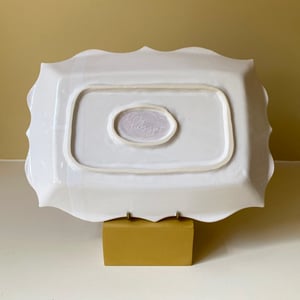 A medium sized ceramic platter, with a hand cut detailed edge. The edge features a slip trailed, relief dotted detail. The main body is painted with a pink underglaze. The central painting features a Norfolk field, with a deer and a woman wandering alongside her two whippets.