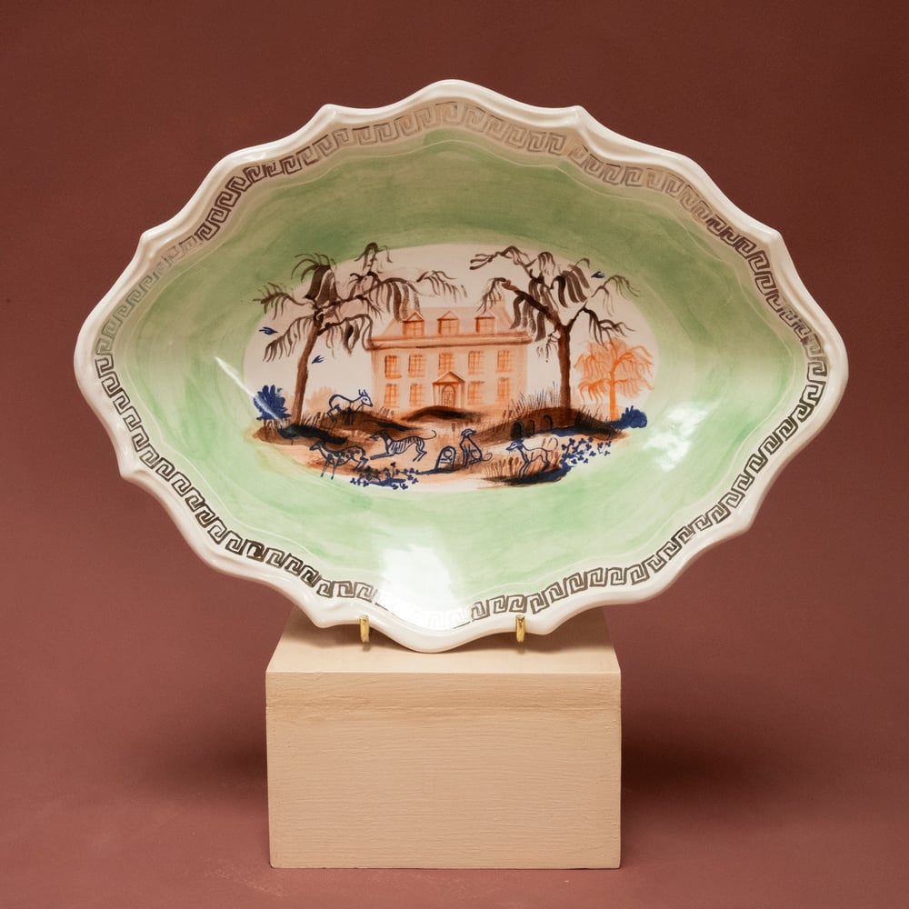 A handmade ceramic bowl with a hand cut decorative edge. The rim has a slip trailed detail. The main body of this piece is painted with a green underglaze. The central painting is of a large Georgian house. There are Whippets roaming around in the foreground, with deers and clovers. there are two Willow trees either side of the house.