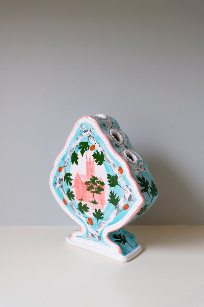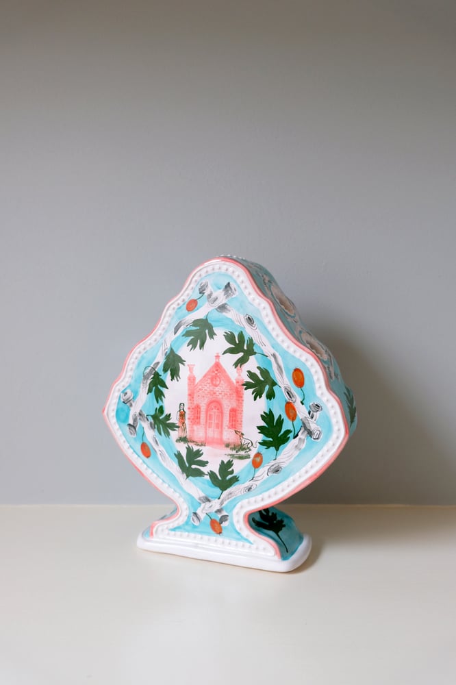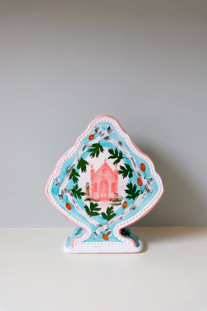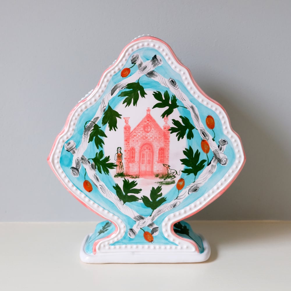The shape of this Romantic Vase is inspired by a Dutch gable. It is a solid hand-built piece, with cut-out holes running along the top to arrange stems of flowers. The rim of the vase is slip-trailed with a relief-dotted detail. The Hawthorn branches are decorated with a resist technique, which gives them a lovely graphic feel and contrasts with the hand-painted elements. The central illustration is a painting of a pink folly with a woman and her whippet.