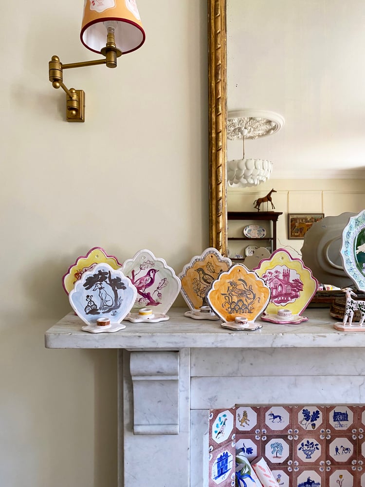 Inspired and informed by traditional ceramic shapes, but slab-built to create a modern take on a traditional vessel. Each piece is handmade and bisque-fired. They are then dipped in a Tin glaze with each one painted upon using oxides and pigments. These loose paintings upon the ceramics make each piece an original work of art. Each piece is illustrated with a drawing inspired by places, historical and childhood stories.